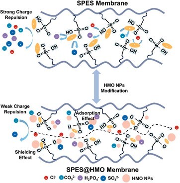 針對上述挑戰(zhàn),中國科學(xué)院青海鹽湖研究所離子吸附科學(xué)與技術(shù)課題組提出了一種氯離子膜“電荷屏蔽效應(yīng)”設(shè)計(jì)策略,開發(fā)了一種由磺化聚醚砜(SPES)與水合錳氧化物(HMO)顆粒復(fù)合的新型混合基質(zhì)膜-氯離子吸附膜(SPES@HMO)。該膜利用HMO納米顆粒調(diào)控膜界面電荷環(huán)境,從而特異性增強(qiáng)氯離子的傳輸,同時(shí)結(jié)合競爭吸附機(jī)制抑制多價(jià)陰離子的通過,為高鹽廢水中氯離子的高精度篩分提供了全新解決方案。