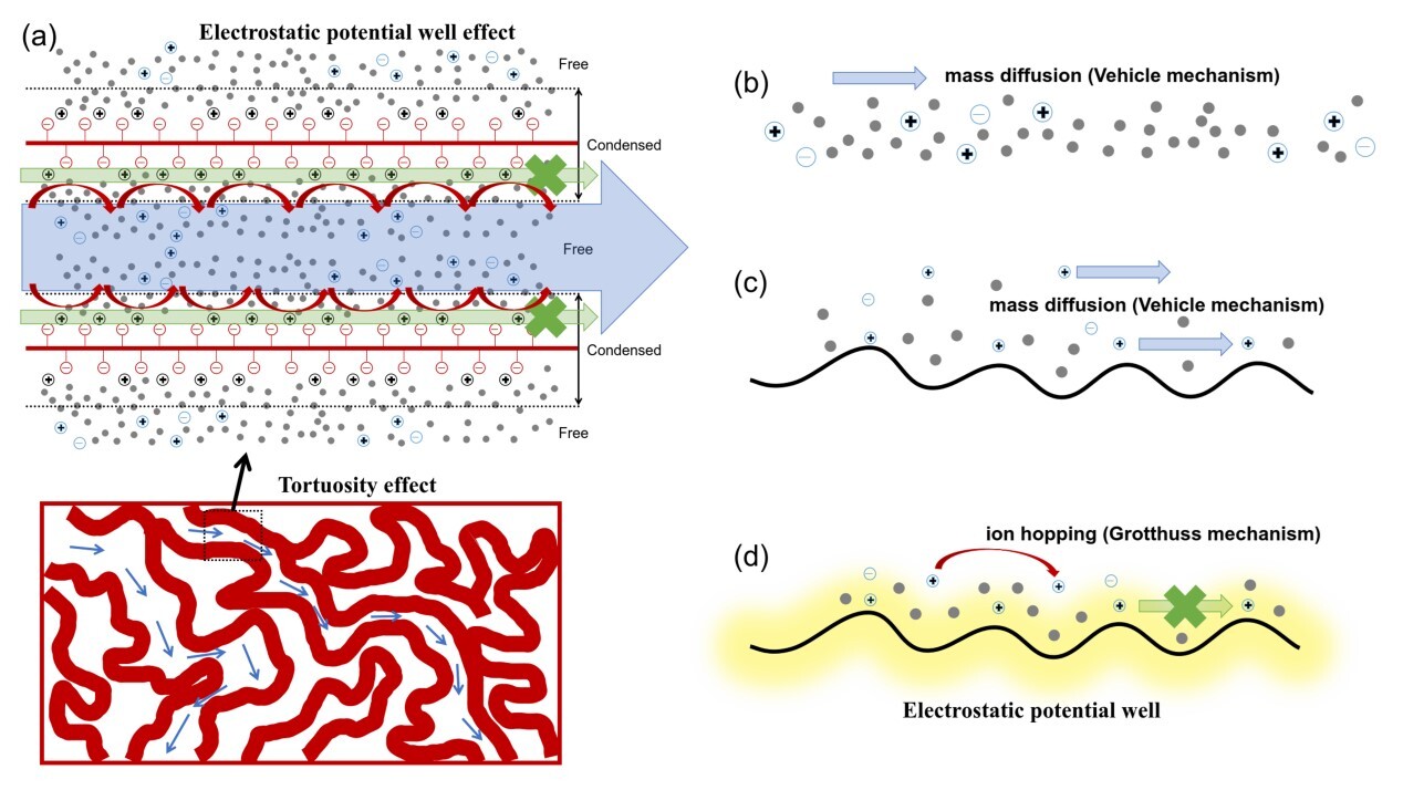 圖1. 迂曲的高電荷密度納米離子傳輸通道內的“反離子異常傳輸增強”機制示意圖及其與其它離子傳輸機制(純水溶液和之前認為的膜內離子傳輸機制)的差異