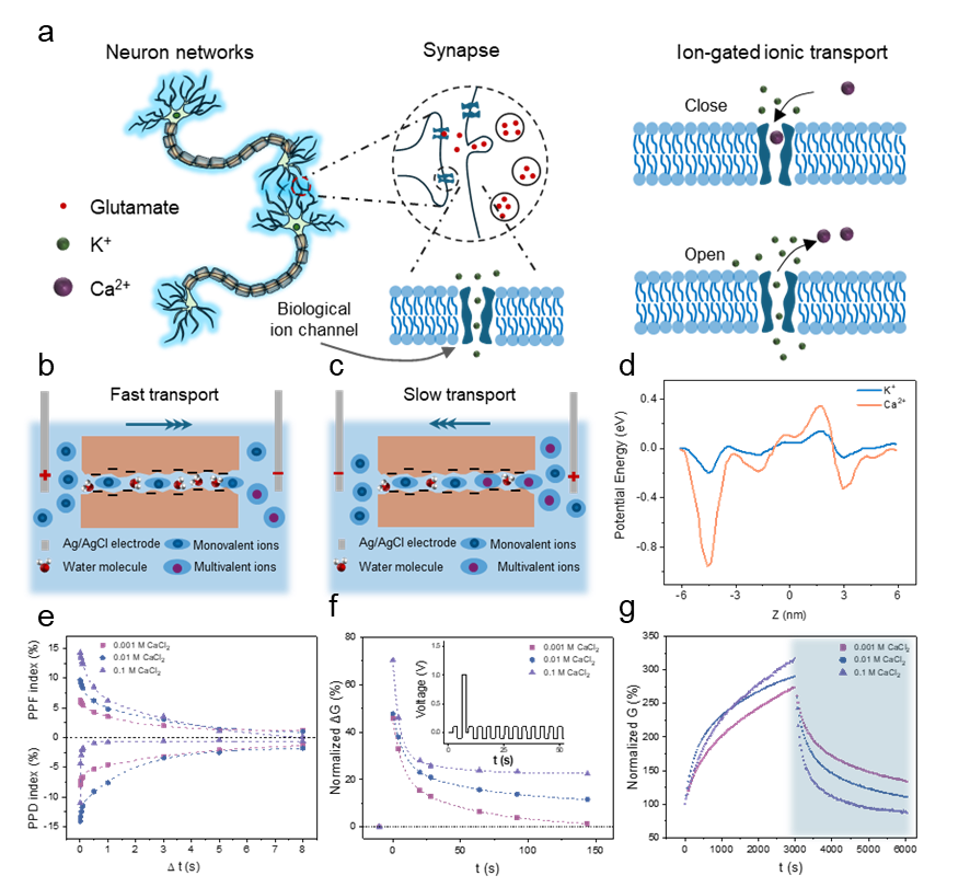 憶阻器被視為構(gòu)建類腦神經(jīng)形態(tài)計算體系的核心元件。然而,現(xiàn)有的納米流體憶阻器中的離子的記憶多依賴于濃度極化等瞬態(tài)過程,外電場撤去后離子分布迅速恢復平衡,記憶信息往往在數(shù)秒內(nèi)快速消散,難以實現(xiàn)長時程增強等非易失性功能。