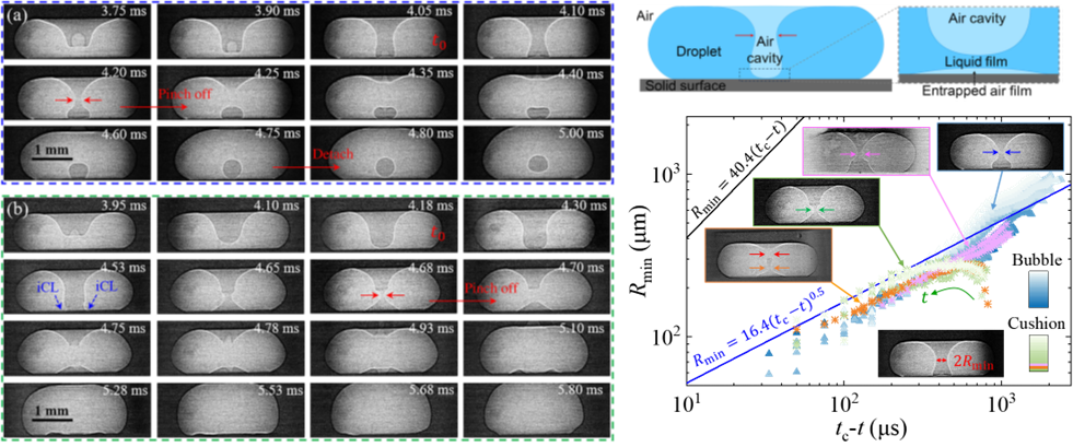 研究團隊結合傳統(tǒng)高速攝像技術和上海光源快速X射線成像線站(BL16U2)的快速X射線成像技術,系統(tǒng)研究了液滴撞擊超疏水納米多孔表面過程中氣腔的演化行為,在韋伯數(shù)約為2-5的狹窄范圍內,首次同時觀察到氣腔的兩種演化路徑:一是演變?yōu)橐旱蝺炔康捏w相氣泡,二是發(fā)展為液滴下方的環(huán)形氣墊。研究團隊識別了慣性主導的軸向內爆、毛細波驅動的頸縮以及兩者混合的三種氣腔夾斷機制,發(fā)現(xiàn)氣腔與氣膜間的夾層液膜的穩(wěn)定性是決定演化路徑的關鍵:若液膜不破裂,氣腔受慣性主導發(fā)生內爆,形成體相氣泡;若液膜在亞毫秒時間內破裂,則會觸發(fā)毛細波驅動的頸縮,導致氣腔與下方氣膜融合,最終形成環(huán)形氣墊。這一臨界時間尺度約為0.5毫秒,與慣性-毛細時間尺度相符。