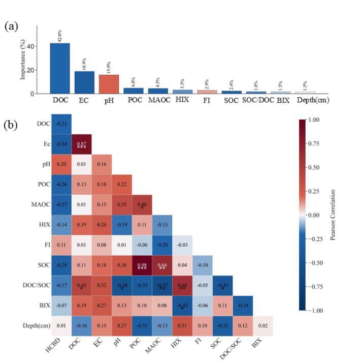 環(huán)境因子與HCBD濃度關系的隨機森林模型結果及相關性分析。(a)隨機森林模型中各環(huán)境變量的特征重要性,按其對HCBD濃度預測的貢獻度排序。(b)HCBD與環(huán)境因子的Pearson相關矩陣;紅色和藍色方框分別表示正相關和負相關。