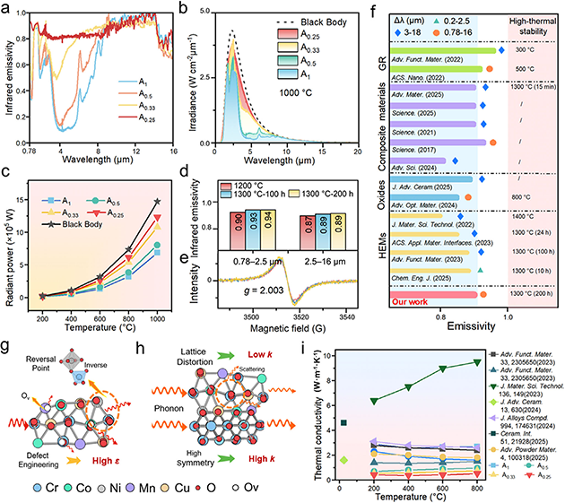近期,該團(tuán)隊設(shè)計了一種將構(gòu)型熵與反尖晶石有序化耦合的通用化學(xué)策略,以實現(xiàn)穩(wěn)鍵的寬帶紅外發(fā)射率,在紅外輻射熱管理領(lǐng)域取得了新進(jìn)展。針對構(gòu)型熵與位點(diǎn)反轉(zhuǎn)、缺陷化學(xué)與晶格動力學(xué)耦合如何調(diào)控紅外輻射性能這一科學(xué)問題,該團(tuán)隊通過簡便、低成本的固相合成法,采用熵驅(qū)動位點(diǎn)反轉(zhuǎn)設(shè)計合成了中熵氧化物(Co0.25Ni0.25Mn0.25Cu0.25)Cr2O4(如圖1),重點(diǎn)研究了中熵氧化物內(nèi)部混合價態(tài)、氧空位和電子結(jié)構(gòu),結(jié)果表明,熵驅(qū)動位點(diǎn)反轉(zhuǎn)促進(jìn)了混合價態(tài)和豐富氧空位,增強(qiáng)了軌道雜化并激活了紅外聲子,將傳統(tǒng)尖晶石氧化物轉(zhuǎn)化為近黑體、耐高溫的紅外輻射體;該材料在0.78–16 μm波段的發(fā)射率達(dá)0.90,其中在1000 °C以上關(guān)鍵輻射換熱窗口(2–8 μm)的發(fā)射率是二元氧化物的兩倍以上(如圖2);材料在1300 °C下經(jīng)過200小時高溫老化后,仍保持單相結(jié)構(gòu)和高發(fā)射率;塊體材料表現(xiàn)出低熱導(dǎo)率(800 °C時為0.53 W·m-1·K-1),作為可噴涂涂層在鋼和耐火材料上實現(xiàn)約0.96的發(fā)射率,模擬顯示可使?fàn)t內(nèi)溫度提高約44.3 °C。