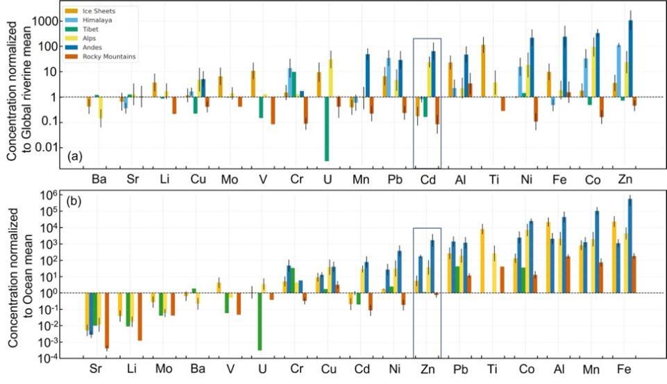 冰川與冰蓋融水中痕量金屬濃度相對(duì)于全球河流和海洋平均濃度的對(duì)比