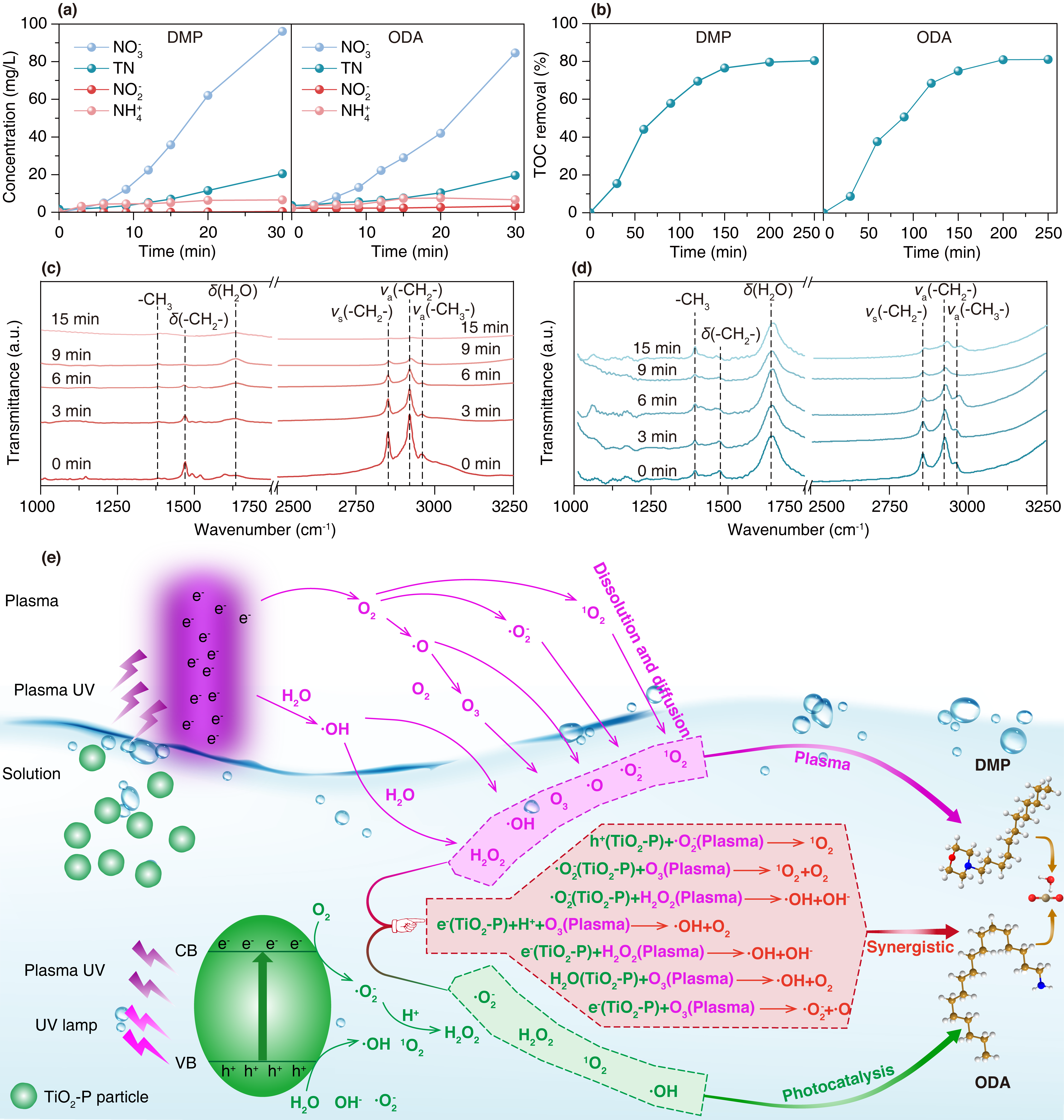 高鹽工業(yè)廢水中常含有難降解有機(jī)污染物,鹽分又會顯著抑制活性氧物種作用效率,導(dǎo)致高級氧化過程處理效果下降,因此高鹽有機(jī)廢水治理一直是環(huán)境工程領(lǐng)域的技術(shù)難點(diǎn)。針對鉀鹽浮選尾鹽中十八胺(ODA)和十二烷基嗎啉(DMP)典型浮選藥劑難以高效去除的問題,研究團(tuán)隊構(gòu)建了一種非熱等離子體與光催化串聯(lián)協(xié)同體系,并通過等離子體誘導(dǎo)缺陷工程策略制備出富含表面氧空位和Ti3?活性位點(diǎn)的TiO2光催化材料(TiO2-P),實現(xiàn)了真實高鹽尾礦鹵水中有機(jī)污染物的快速高效降解。
