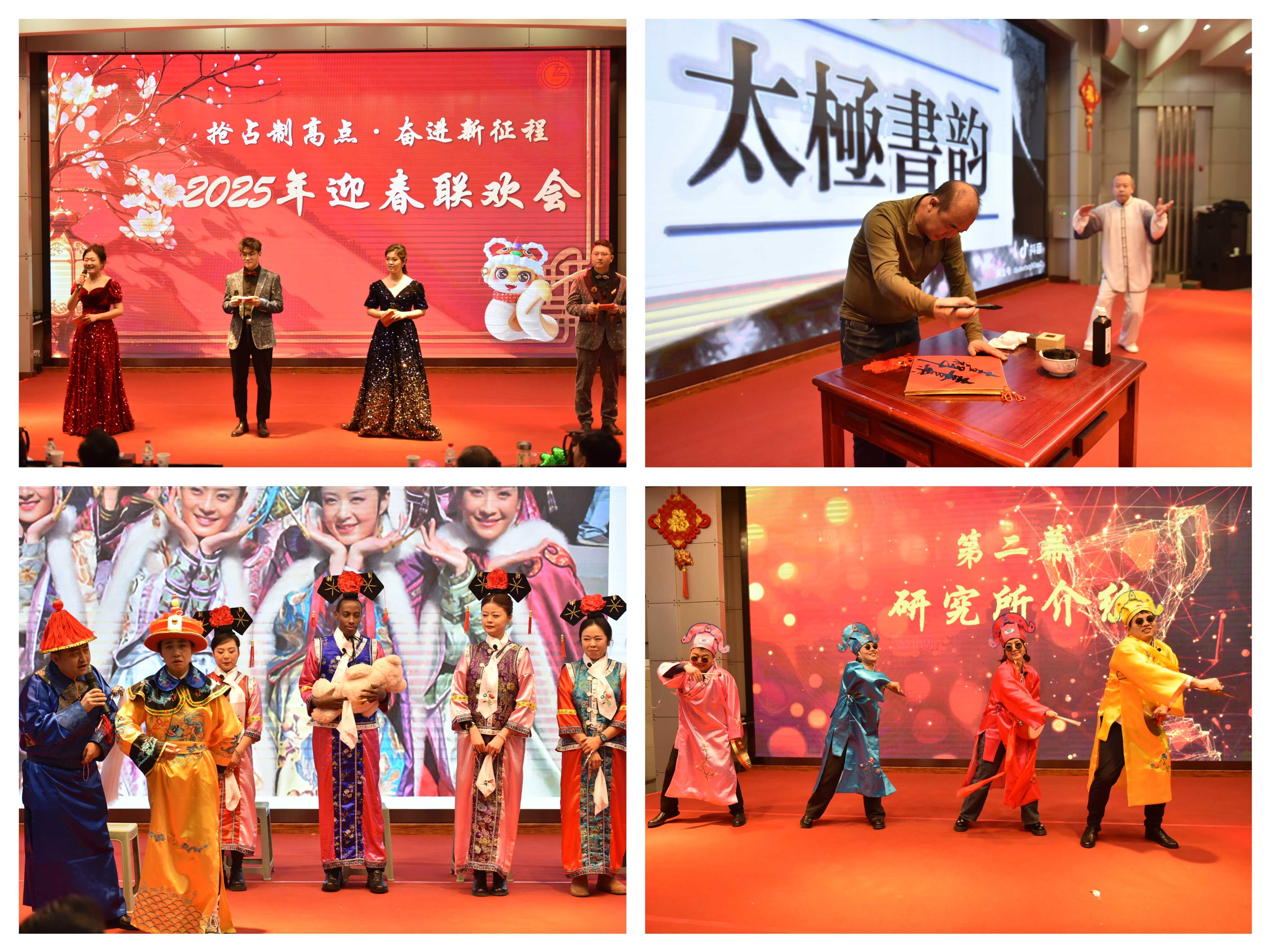 聯(lián)歡會在舞蹈《張燈結(jié)彩》歡快的節(jié)奏中拉開序幕。所領(lǐng)導(dǎo)班子全體成員共同朗誦的詩歌《勇?lián)厝?科技報國》高亢激昂,深情回顧了研究所六十余年奮斗歷程與輝煌成就,共同擘畫了未來發(fā)展的美好藍(lán)圖,充分展現(xiàn)了蘭州化物所人再赴新征程的百倍信心。退休老同志們表演的合唱《走向復(fù)興》《革命人永遠(yuǎn)是年輕》整齊嘹亮,表達(dá)了老一輩科研工作者扎根西部、無怨無悔,開拓奮進(jìn)、科技報國的壯志情懷。小品《后宮甄嬛·科研傳》、三句半《勁在科研》則以幽默詼諧的方式再現(xiàn)了科研工作中的樂趣與故事。合唱《如愿》表達(dá)出對祖國的美好祝愿。書法與太極拳表演《太極書韻》剛?cè)岵?jì)、行云流水,展示了中華文化的魅力。舞蹈與古箏演奏《漁舟唱晚》展現(xiàn)了科苑少年的自信與風(fēng)采。獨唱《今天》《卓瑪》歌聲悠揚婉轉(zhuǎn),贏得現(xiàn)場陣陣掌聲,詩朗誦《凹凸棒石頌》抒發(fā)了青年科技工作者的激情與信念?!稛o名的人》《悲傷蛙不悲傷》《唱響世界,奔跑少年》等舞蹈和歌曲串燒節(jié)目充分展現(xiàn)出廣大研究生青春昂揚、蓬勃向上的絢麗風(fēng)采。一個個精彩的節(jié)目將聯(lián)歡會氣氛一次次推向高潮,中間穿插的游戲和抽獎環(huán)節(jié),更是讓全場觀眾體驗到層出不窮的驚喜。