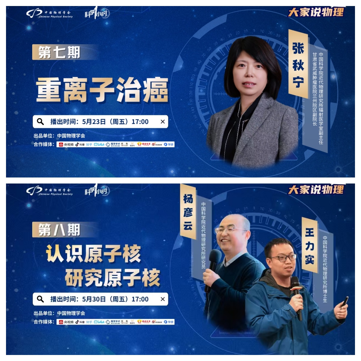 在全國(guó)科技周期間,受中國(guó)物理學(xué)會(huì)邀請(qǐng),近代物理所張秋寧研究員、楊彥云研究員及王力實(shí)博士共同參與了“科學(xué)一小時(shí)”科普欄目的錄制,開(kāi)展了題為《重離子治癌》和《認(rèn)識(shí)原子核,研究原子核》的線上科普課程。