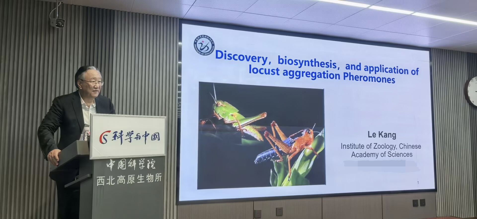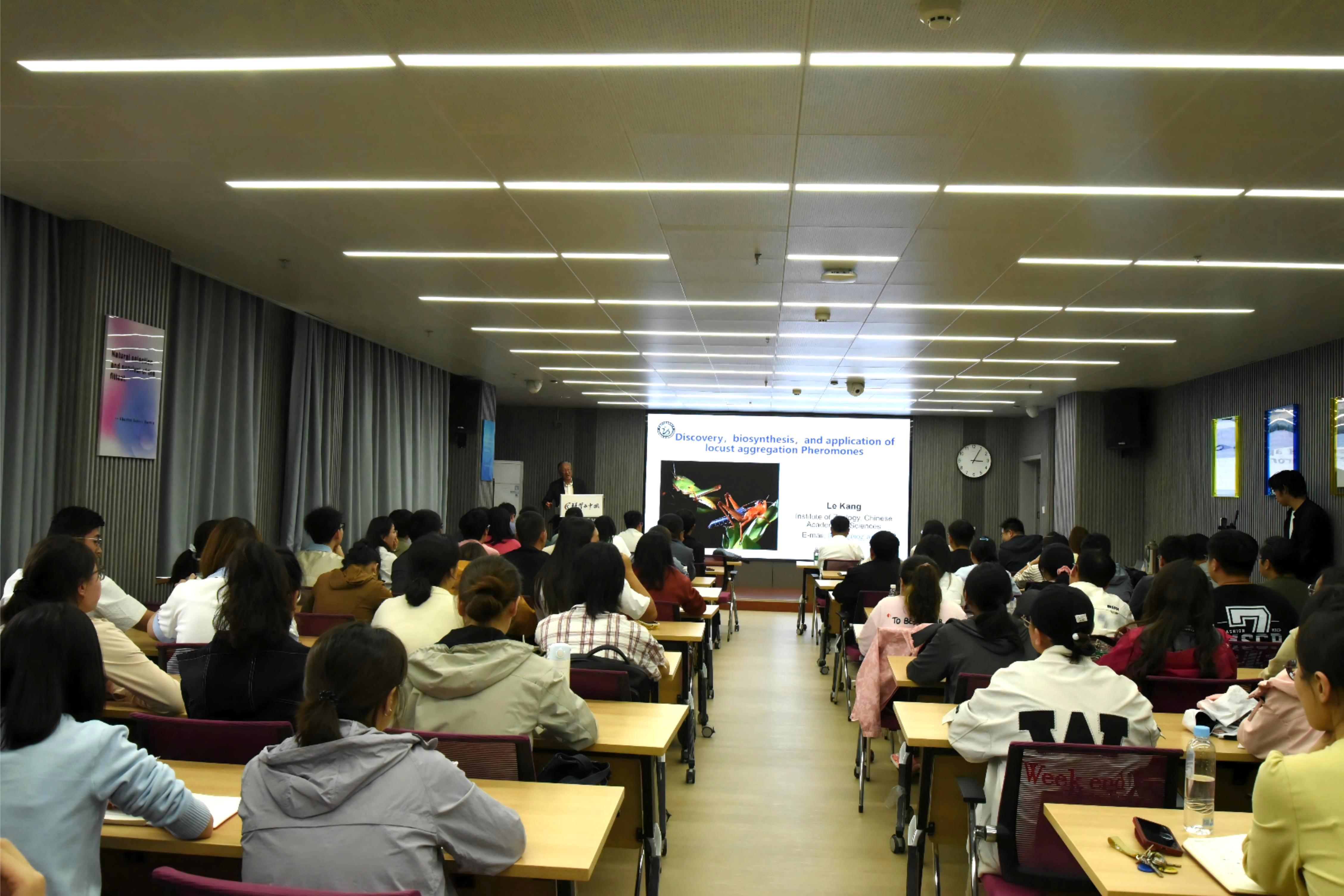 為領(lǐng)略科學(xué)前沿,拓展學(xué)術(shù)視野,點(diǎn)燃科學(xué)創(chuàng)新熱情,8月30日下午,中國科學(xué)院西北高原生物研究所舉辦了主題為“蝗蟲群聚信息素的發(fā)現(xiàn)、生物合成與應(yīng)用”學(xué)術(shù)報(bào)告會。中國科學(xué)院院士康樂受邀擔(dān)任主講嘉賓。西北高原所副所長楊其恩主持報(bào)告會并致辭,西北高原所所長陳世龍出席,辦公室主任王文娟,人事教育處副處長楊紅霞,以及百余名師生聆聽。