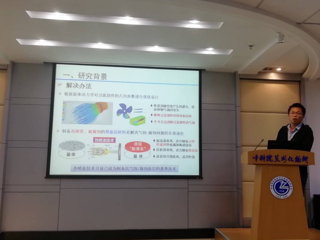 劉士民博士介紹了鋰離子電池電解質(zhì)及單鋰固體導(dǎo)電聚合物(SLiPC) 的研究進(jìn)展,以及他本人基于聚氨酯基的三種SLiPC合成、性質(zhì)、性能以及構(gòu)效關(guān)系方面的研究工作。侯國(guó)梁博士針對(duì)航空發(fā)動(dòng)機(jī)燃油蝸殼、輪船的螺旋槳和水輪機(jī)葉片等眾多過(guò)流部件存在的嚴(yán)重氣蝕/腐蝕問(wèn)題,開(kāi)展的多種熱噴涂涂層的氣蝕/腐蝕性能研究。馬鵬軍博士針對(duì)超級(jí)電容器在低溫條件下電化學(xué)性能不佳的問(wèn)題,采用外部加熱的方式,巧妙地將具有較高光譜選擇性吸收特性的尖晶石型光-熱轉(zhuǎn)化涂層構(gòu)筑到超級(jí)電容器器件表面。張耀明博士介紹了其基于聚合誘導(dǎo)自組裝(PISA)法制備多種嵌段共聚物納米結(jié)構(gòu),并實(shí)現(xiàn)其形貌演化的可控調(diào)控方面的研究工作,以及基于PISA法制備的刺激-響應(yīng)性聚合物在可控潤(rùn)滑材料中的應(yīng)用等工作。報(bào)告結(jié)束后,王紅利副研究員向四位報(bào)告人頒發(fā)了榮譽(yù)證書。