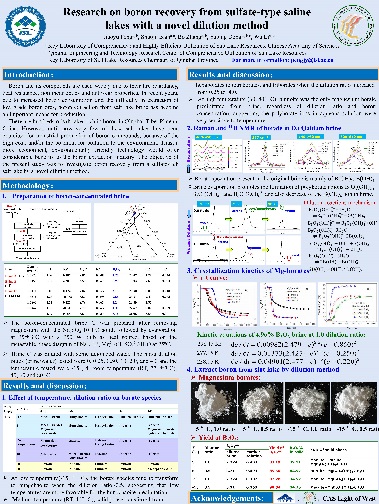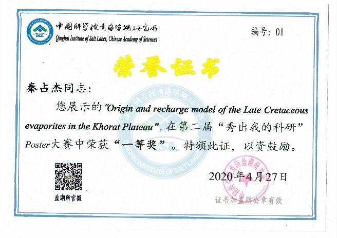 經(jīng)過(guò)專家評(píng)審和網(wǎng)絡(luò)投票,最終秦占杰博士《Origin and recharge model of the Late Cretaceous evaporites in the Khorat Plateau》和彭嬌玉博士《Research on Boron Recovery from Sulfate-type Saline Lakes with a Novel Dilution Method》,王廣國(guó)同學(xué)《Structure Study of Aqueous CaCl2 Solutions by Molecular Dynamics Simulations》和高靖易同學(xué)《Prehistoric human Activity and its Environmental Background in Lake Donggi Cona Basin, Northeastern Tibetan Plateau》分別斬獲大賽職工組和研究生組一等獎(jiǎng);高春亮博士等6名同志獲得二等獎(jiǎng),孫艷霞博士等10名同志獲得三等獎(jiǎng),本屆大賽為獲獎(jiǎng)?wù)咴O(shè)計(jì)了精美的證書(shū)。