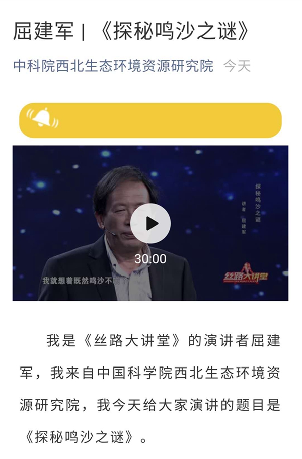 在西北研究院微信公眾號推送了屈建軍研究員主講的《探秘鳴沙之謎》科普報告,報告講述了其研究團隊通過長年的科學研究,發(fā)現(xiàn)自然沙粒表面的多孔(坑)狀結構所構成的共鳴腔,是鳴沙發(fā)聲的關鍵所在。就像掏耳朵一樣,把堵在孔洞里的臟東西洗干凈,鳴沙就“復聲”了,實現(xiàn)了鳴沙的修復,成功復活了鳴沙自然現(xiàn)象,讓失聲的沙子再“唱歌”。