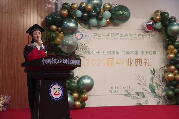 畢業(yè)典禮在莊嚴(yán)的國歌聲中拉開序幕。優(yōu)秀畢業(yè)生代表閆榮格博士首先發(fā)言。她代表全體畢業(yè)生懷著感恩的心和美好的希望,向培養(yǎng)他們的研究所和辛勤付出的導(dǎo)師們送上了最真摯的謝意和最美好的祝福。她說明年將是西高所建所60周年,在過去的數(shù)十年間,一批又一批科學(xué)家義無反顧地來到青海,扎根青海,克服困難,奉獻(xiàn)高原,為科學(xué)前沿、國家需求和地方發(fā)展做出了重大貢獻(xiàn),培養(yǎng)了一大批杰出的人才,很榮幸作為西高所的一份子,很榮幸,這里是大家的精神家園。在此出發(fā),胸懷夢想不懈奮斗!