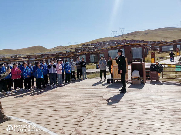 在為期兩天的行程中,同學(xué)們先后參觀了青海湖和海北原子城紀念館,在老師的指導(dǎo)下學(xué)習(xí)如何樹立自信心,增強合作意識,了解與青藏高原相關(guān)的地質(zhì)地理知識,感受兩彈一星老科學(xué)家們無私奉獻和創(chuàng)新報國的精神等。此外,大家還分組團隊合作自己設(shè)計團隊游戲,展示個人才藝,氣氛融洽而熱烈。尤其是在展示個人才藝環(huán)節(jié)還發(fā)生了一個有趣而暖心的小插曲,同學(xué)們的歌舞表演不僅吸引了周圍游客的關(guān)注,也引起了一位從四川九寨溝遠道而來的藏族歌手的注意,這位歌手被同學(xué)們的表演所感染,用他特有的嗓音欣然為同學(xué)們演唱了他自己原創(chuàng)的歌曲,并鼓勵同學(xué)們努力學(xué)習(xí),成為對國家對社會有用的人才。