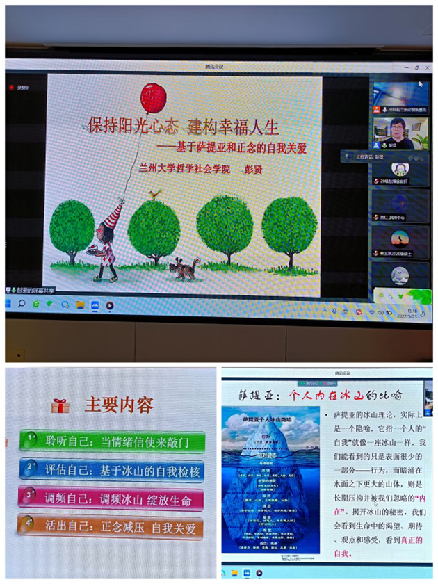 講座特邀蘭州大學(xué)哲學(xué)社會(huì)學(xué)院、心理中心兼職督導(dǎo)師彭賢副教授作了題為“保持陽光心態(tài) 建構(gòu)幸福人生——基于薩提亞和正念的自我關(guān)愛”的報(bào)告。報(bào)告圍繞聆聽自己、評(píng)估自己、調(diào)頻自己、活出自己四個(gè)方面,結(jié)合大量案例解析,介紹了薩提亞和正念的心理調(diào)節(jié)方法和技巧。