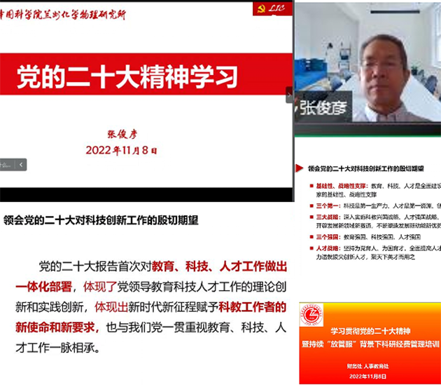 黨委委員、副所長張俊彥作了題為“黨的二十大精神學(xué)習(xí)”的專題報告。報告?zhèn)鬟_(dá)了習(xí)近平總書記在中國共產(chǎn)黨第二十次全國代表大會上的報告,重點解讀了報告對科技創(chuàng)新、人才工作的新要求新部署。他強調(diào),全體人員要充分認(rèn)識學(xué)習(xí)宣傳貫徹黨的二十大精神的重大意義,全面準(zhǔn)確學(xué)習(xí)領(lǐng)會黨的二十大精神,尤其要全面準(zhǔn)確把握黨的二十大對科技創(chuàng)新工作的新要求新部署,切實增強國家戰(zhàn)略科技力量的責(zé)任感使命感,將學(xué)習(xí)的成效轉(zhuǎn)化為推進(jìn)工作、促進(jìn)研究所發(fā)展的強大動力。