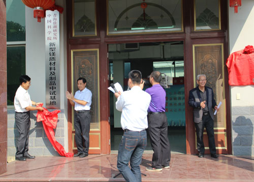 張金初、段東平、支洋波和肖學英代表雙方進行了“新型鎂質(zhì)膠凝材料工程技術(shù)聯(lián)合研究中心”和“新型鎂質(zhì)材料及制品中試基地”的揭牌。揭牌儀式結(jié)束后,來賓參觀了板材生產(chǎn)線和新型海工鎂水泥試驗場地。