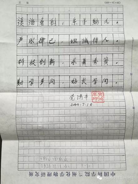 2004年7月10日,黨鴻辛躺在醫(yī)院病床上,在標識有“中國科學(xué)院蘭州化學(xué)物理研究所”字樣的一張稿紙上寫下遺訓(xùn):