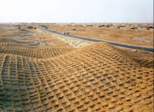 實際上,草方格最早應用于我國第一條沙漠鐵路包蘭鐵路的建設中。在寧夏沙坡頭地區(qū)火車穿越了騰格里沙漠,在科技工作者和當?shù)厝罕姷墓餐ο?,麥草方格編成的巨網(wǎng)最終成功縛住了“沙龍”。沙坡頭因此被稱為“草方格的故鄉(xiāng)”。如今,一把鐵鍬,一捆麥草,一片草方格,沙坡頭實現(xiàn)了黃沙變綠洲的嬗變,騰格里沙漠中神奇地出現(xiàn)了一條連綿延伸的“綠帶”。