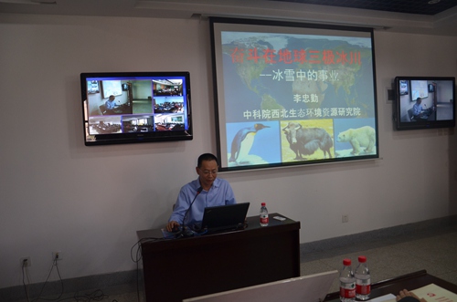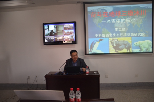李忠勤結合自己在高寒極端環(huán)境無私奉獻30年的難忘工作經歷,為與會人員深情講述了他《奮斗在地球三極冰川》的感人故事。他的報告分“北極科學考察介紹”、“走進南極”和“中國冰川定位觀測”三個部分,通過普及地球三極(南極、北極和青藏高原)知識、梳理回顧世界及中國冰川科考歷史、介紹中國冰川科考站情況及科考隊感人事跡,為大家作了一場生動、感人的報告,一幅幅珍貴難得的實地照片再現了冰川科考工作的極端艱辛,一句句深情感人的樸實語言展示了共產黨人無私奉獻的政治品格。同時,他強調指出,他所在的科研團隊結合冰凍圈科學研究以野外工作為基礎,具有人員分散、工作辛苦等特點的實際,制定了以黨小組為單元,研究室支部、所黨委聯動的“兩學一做”方案,以科研工作為載體和抓手,深入扎實推進“兩學一做”學習教育,取得了良好效果,發(fā)揮了黨支部是戰(zhàn)斗堡壘作用。他的報告圖文并茂,真實感人,既是一場科普報告,更是一場生動黨課,受到與會人員歡迎和好評。